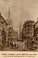 Description: Black and white sketch from c.1730 looking east from Corn Street to Wine Street, Bristol, UK. The church tower visible is that of Christ Church with St Ewen. On the far left of the image, on the north side of the road is the Register Office (previously the old Council House). In the centre of the junction can be seen the Bristol High Cross, and on the right of the image, on the south side of Wine Street is The Dutch House, destroyed during the Bristol Blitz. The street scene shows a lot of people, a horse and cart, and a sedan chair.
