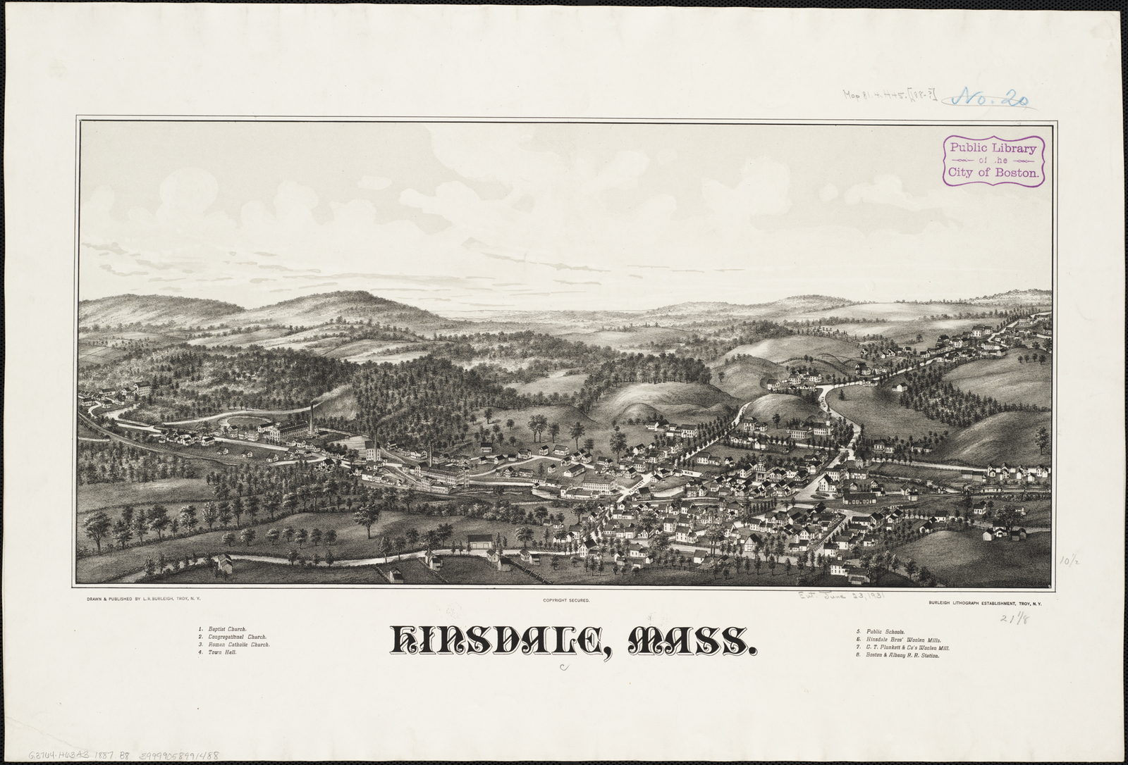Description: Zoom into this map at maps.bpl.org. Author: Burleigh, L. R. Publisher: L.R. Burleigh Date: [1887?] Location: Hinsdale (Mass. : Town) Scale: Not drawn to scale. Call Number: G3764.H63A3 1887.B8