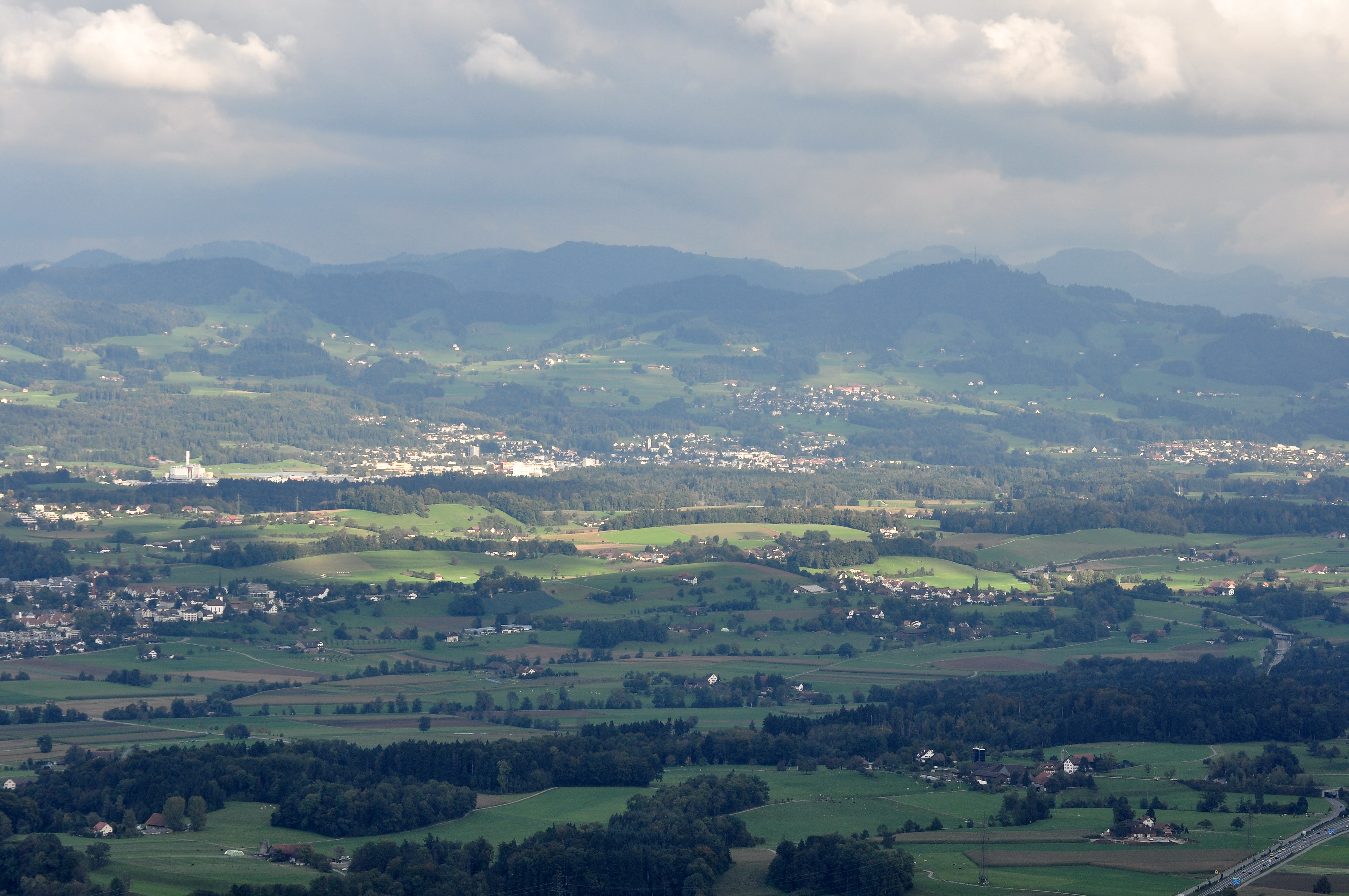 Description: Hinwil (Switzerland) as seen from Pfannenstiel Aussichtsturm, Bachtel mountain and Dürnten (to the right) in background.