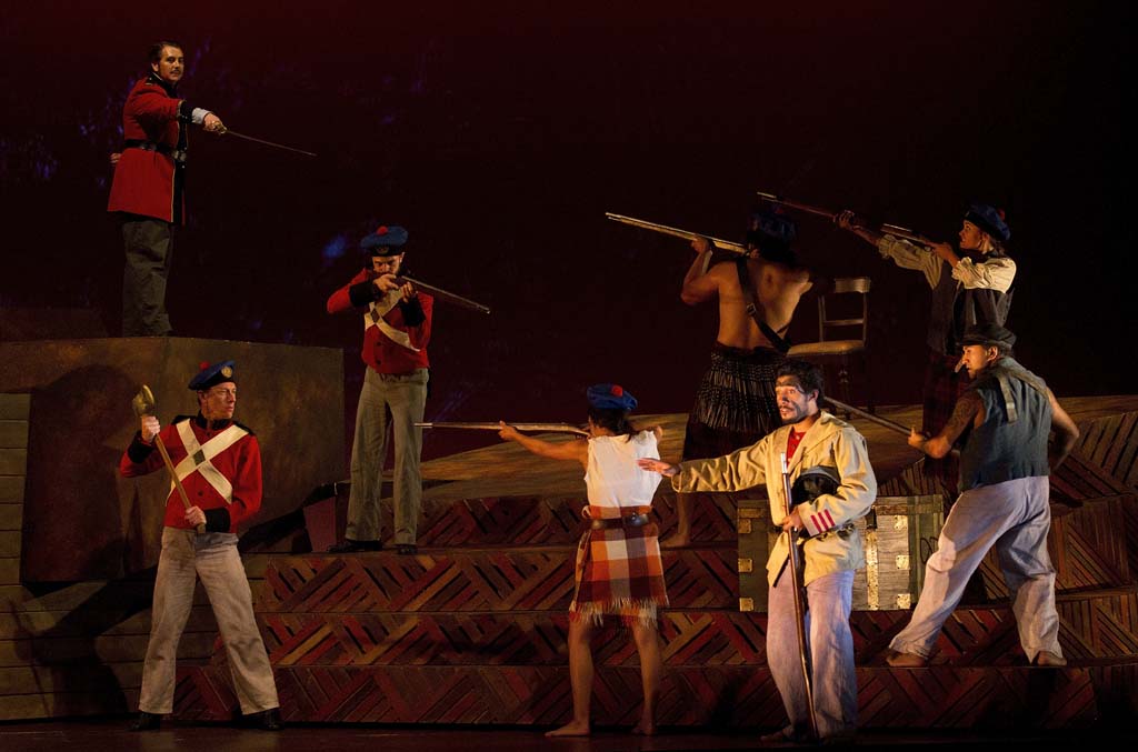 Description: Robert Tucker who plays Army Major (Back) with the cast in the opera Hōhepa, composed by Jenny McLeod, at the Opera House in Wellington, Tuesday 13th of March 2012.