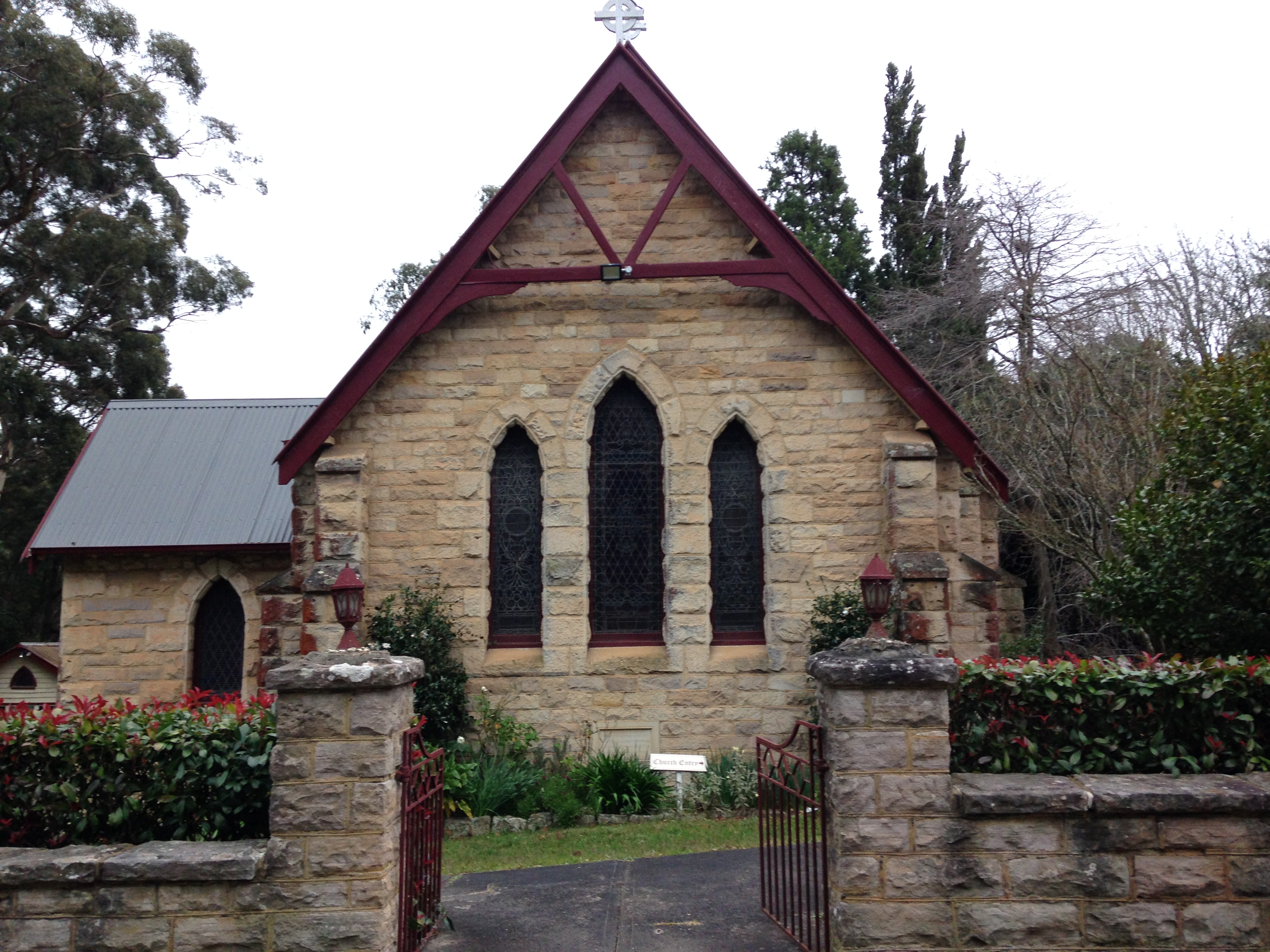 Description: Holy Trinity Church – Anglican church in Bundanoon, New South Wales, Australia – this stone building (1905) replaced a wooden structure (1879), which was destroyed by fire on 31 December 1904.