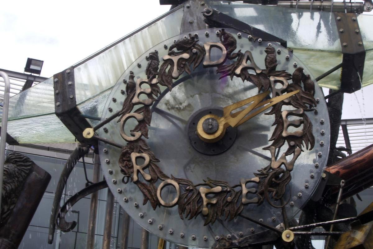 Description: Hornsby Water Clock: detail of clockface on the Swiss pendulum clock.