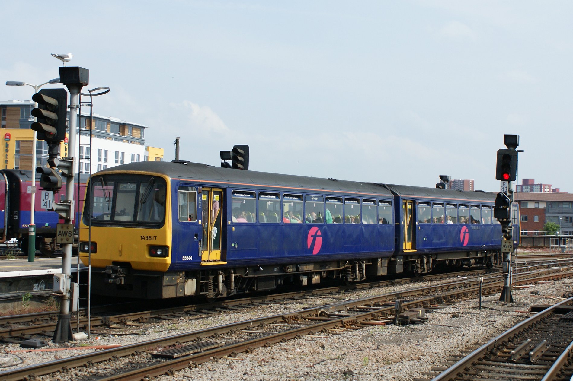 Description: Alexander/Barclay Class 143 "Pacer" local passenger 2-car dmu No.143 617 which is an unusual First Great Western plain purple-blue livery having at Bristol Temple Meads on a rugby special for Cardiff - packed to the gunnels! 05/08.