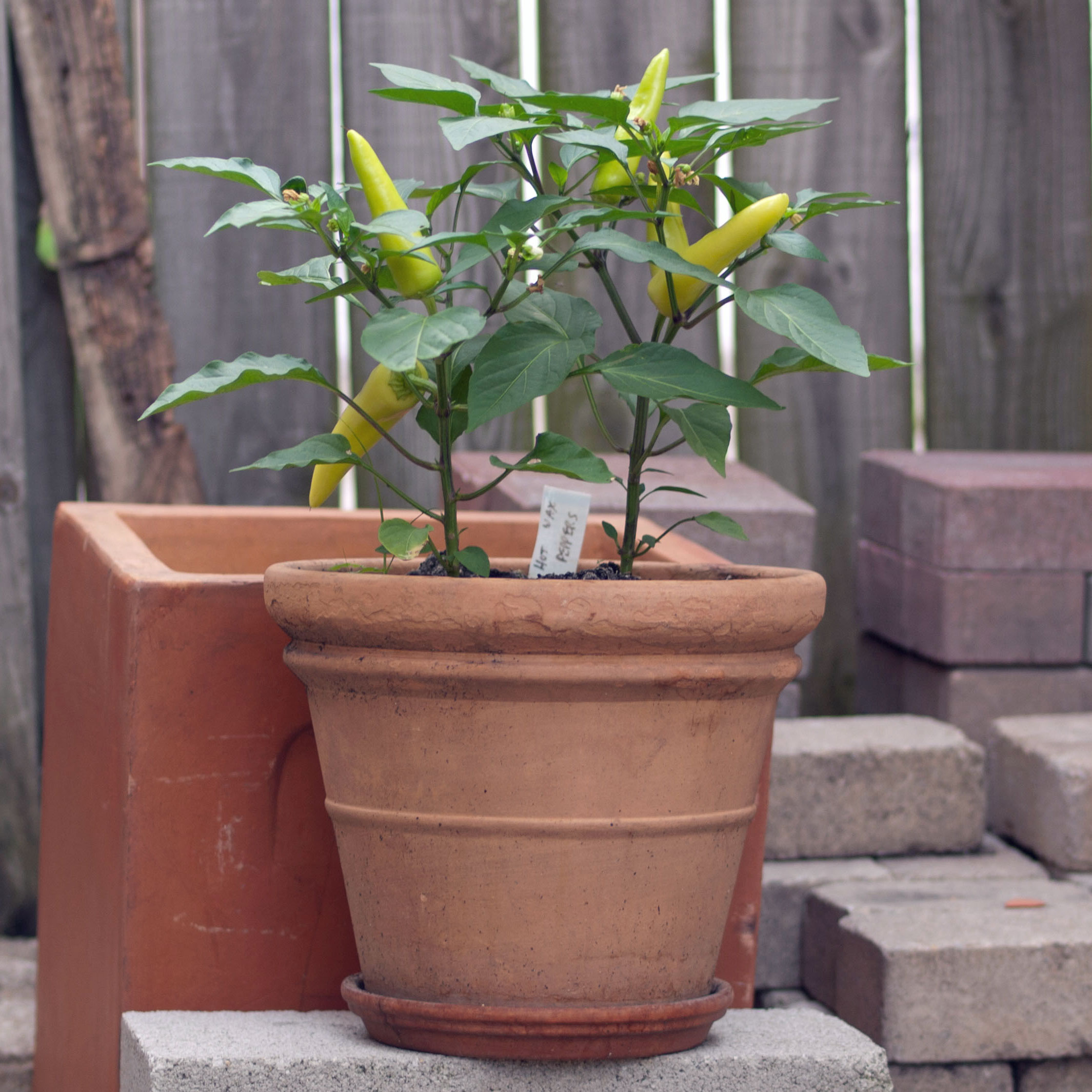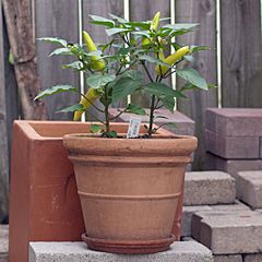 Description: Hungarian wax peppers growing in a home garden clay pot