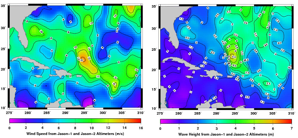 Description: Wave Height and Wind Speed of Hurricane Earl as measured by a three-day composite of data from NASA's Jason-1 and Ocean Surface Topography Mission (OSTM)/Jason-2 satellites, from Aug. 29 to Sept. 1, 2010.