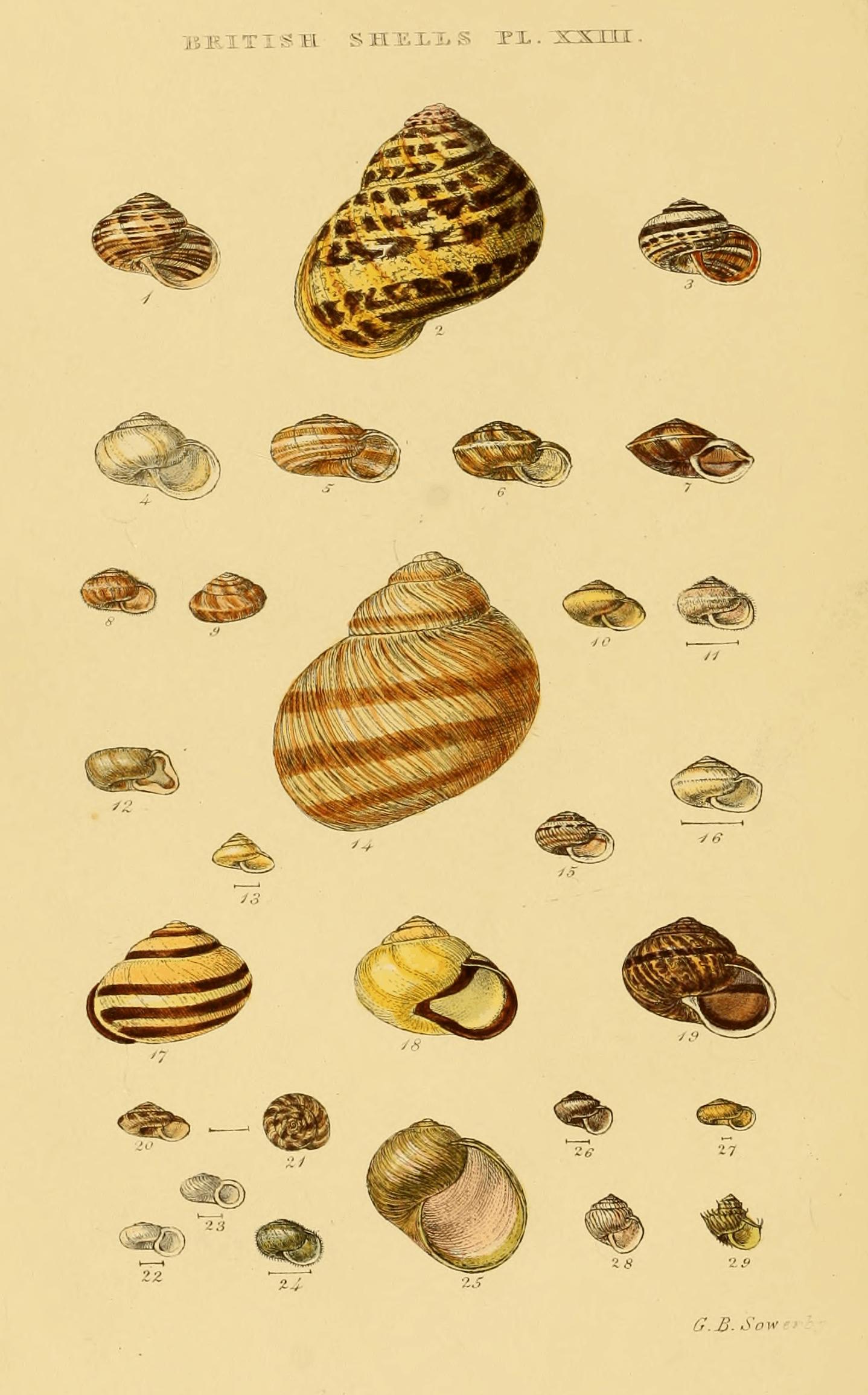 Description: Illustrated Index of British Shells. Plate XXIII. Fig. Name in text Accepted name (2013) 1 Helix pisana Müller Theba pisana 2 Helix aspersa Müller Helix aspersa 3 Helix virgata Costa Cernuella virgata 4 Helix cantiana Montagu Monacha cantiana 5 Helix ericetorum Müller Helicella itala 6 Helix rufescens Pennant Arianta arbustorum 7 Helix lapicida Linnaeus Helicigona lapicida 8, 9 Helix hispida Linnaeus Trochulus hispidus 10 Helix fusca Montagu Zenobiella subrufescens 11 Helix sericea Draparnaud Trochulus sericeus 12 Helix obvoluta Müller Helicodonta obvoluta 13 Helix fulva Müller Euconulus fulvus 14 Helix pomatia Linnaeus Helix pomatia 15 Helix caperata Montagu Candidula intersecta 16 Helix carthusiana Müller Monacha cartusiana 17, 18 Helix nemoralis Linnaeus Cepaea nemoralis 19 Helix arbustorum Linnaeus Arianta arbustorum 20, 21 Helix rotundata Discus rotundatus 22, 23 Helix pulchella Müller Vallonia pulchella 24 Helix revelata Férussac Ponentina revelata 25 Helix aperta Helix aperta 26 Helix umbilicata Montagu Pyramidula umbilicata 27 Helix pygmæa Draparnaud Punctum pygmaeum 28 Helix lamellata Jeffreys Spermodea lamellata 29 Helix aculeata Müller Acanthinula aculeata