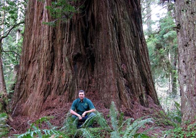 Description: This is an image of an arborist, M. D. Vaden of Oregon (self), in Prairie Creek Redwoods State Park during the Spring of 2008, next to Iluvatar, the 2nd largest known Coast Redwood Sequoia sempervirens at that time. This trip to the park was to photograph and measure some titan redwood trees.