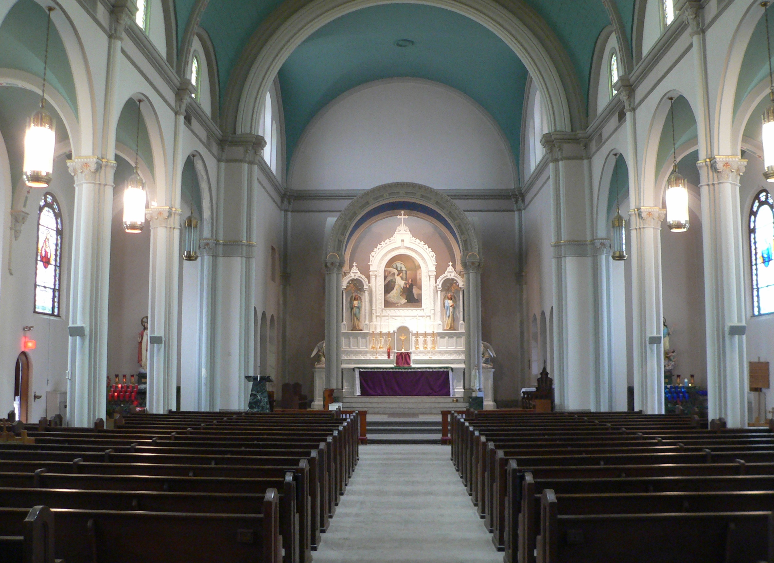 Description: Immaculate Conception Church, located at 2708 S. 24th Street in Omaha, Nebraska: interior, facing west.