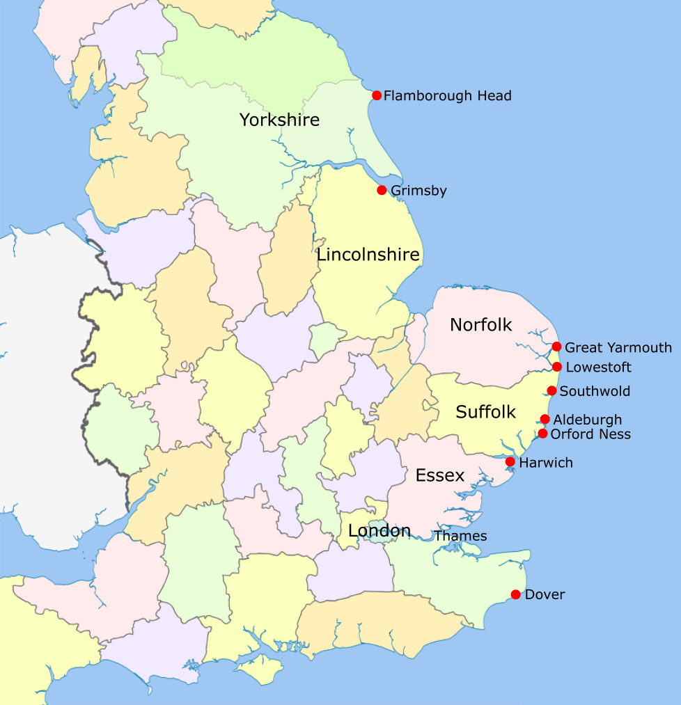 Description: Landing sites considered suitable during German Empire planning for the invasion of the United Kingdom in the late 19th/early 20th century. Base map is a derivative of https://commons.wikimedia.org/wiki/File:English_geographical_counties_1889_with_ridings.svg. Data is sourced from The invasion of the United Kingdom : public controversy and official planning 1888-1918, a PhD thesis written July 1968 by Howard Roy Moon, pp. 669–670