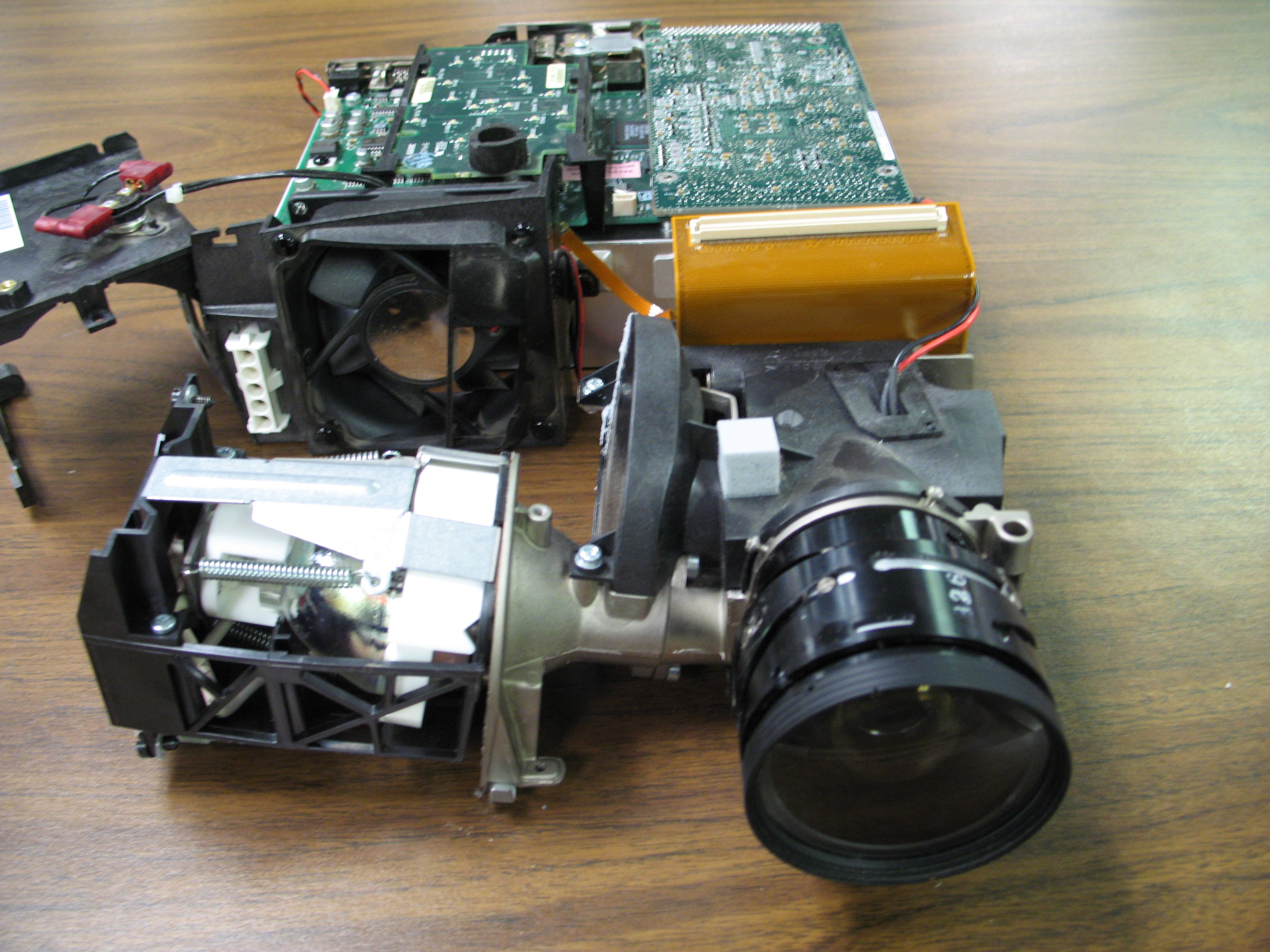 Description: Internal components of an old 1998 InFocus LP425z single-chip DLP projector, with a 4-segment color wheel.Front section shows high-pressure metal halide lamp, color wheel (under round shroud), rear optics assembly containing the DMD, and zoom/focus lens.In the rear, the bottom portion is the power supply for the lamp and electronics, the large circuit board is the video signal input and processing, the small board on top-left is the user interface for the menu buttons, and the small board on the top-right is the interface to the DMD and color wheel. Off to the left is the lamp cage and temperature sensor.
