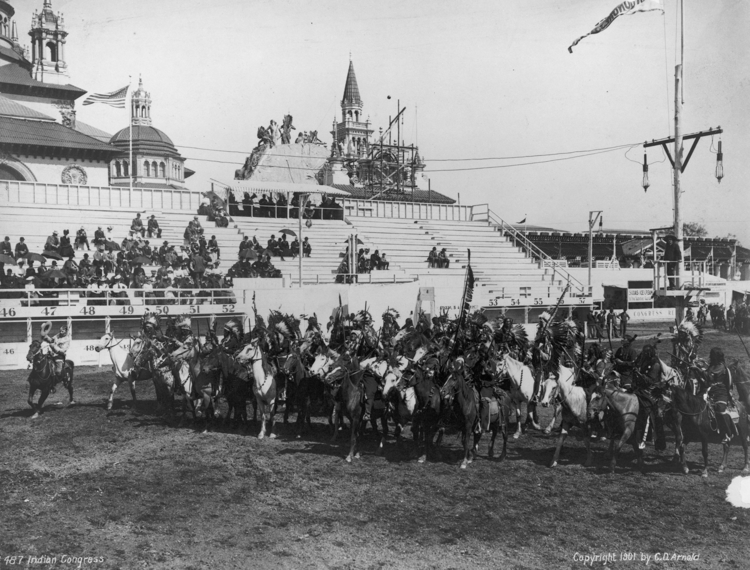 Description: Photographs show large group of Native Americans mounted on horseback during a wild west show at the Pan-American Exhibition, Buffalo, N.Y.