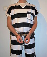Description: Inmate in striped uniform and Smith & Wesson restraints (model 1 "universal" handcuffs secured with a model 1840 belly chain)