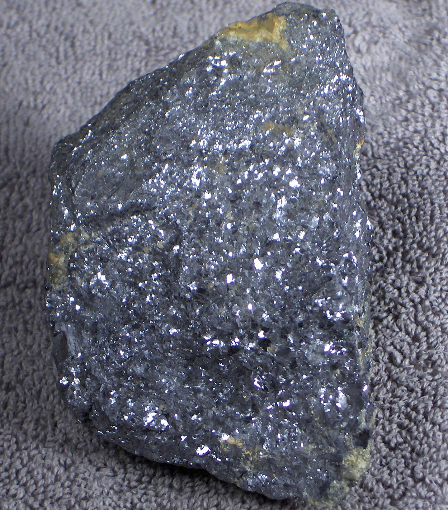 Description: Sparkly prospecting sample of galena from the undeveloped VMS (Volcanic Massive Sulphide) Izok Lake deposit, Nunavut Territory, Canada. Fist-sized chunk was collected from the 'Discovery Boulder' on an island in Izok Lake. This boulder was reduced into souvenirs over time. It was part of a boulder train which led to geophysical surveys and discovery of the deposit by diamond drilling beneath the waters of Izok Lake. ID tip: galena (lead sulphide) is very heavy and forms cubes or right-angled corners.