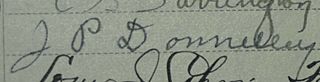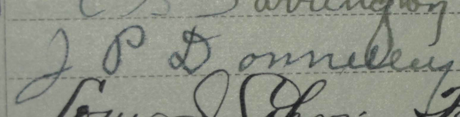 Description: Signature of J. P. Donnelley. Leader of the posse involved in the Battle of Kelley Creek. The signature is taken from a registered mail signing book from Carson City, NV - 1912 - 1913 from the private collection of H. Blair Howell.