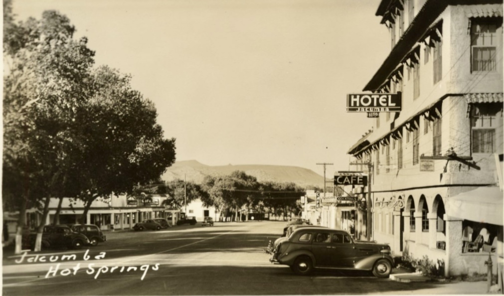 Credit: https://csl.primo.exlibrisgroup.com/discovery/fulldisplay?docid=alma990013927270205115&context=L&vid=01CSL_INST:CSL Title Jacumba Hot Springs Subject Cafes -- California -- Jacumba Hotels -- California -- Jacumba Streets -- California -- Jacumba Jacumba (Calif.) Photographic prints Photographic postcards Genre Photographs Photographic prints Photographic postcards Description View looking down a street in Jacumba. The Jacumba Hotel is seen on the right. Cafes are also seen along the street. Contents 2009-0781. Creation Date 194-? Format 1 photographic print (postcard) ; 3 4/8 x 5 4/8 in. Source Library Catalog Collection Path