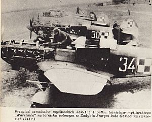 Description: Airfield of 1 Pułk Lotnictwa Myśliwskiego in Stare Zadybie(?). Yakovlev Yak-9 aircraft are being serviced (wrong caption).