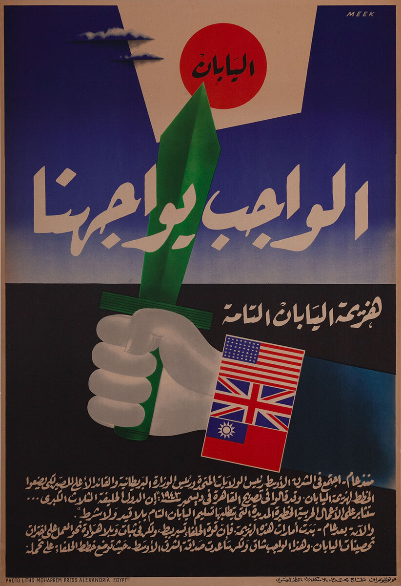 Description: Painting of hand holding upraised sword. Cuff of sleeve is US, UK, Nationalist Chinese flags. Arabic text at bottom talks of 1943 Cairo Conference and 1944 resolve to defeat Japan.