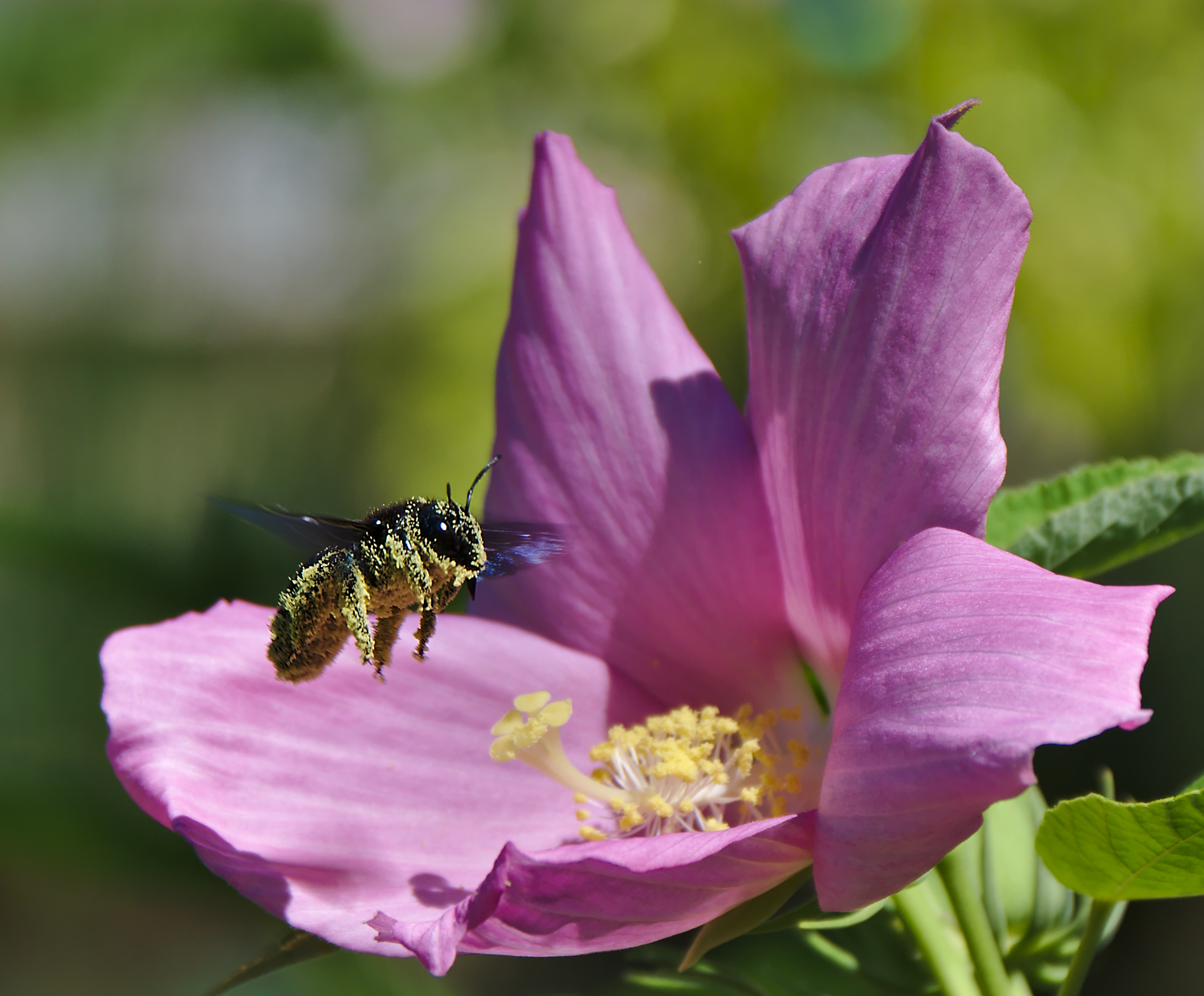 Description: Violet carpenter bee Xylocopa violacea on a Hibiscus mutabilis flower in the botanical garden Jardins des Martels.