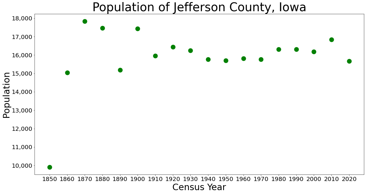 Description: The population of Jefferson County, Iowa from census data