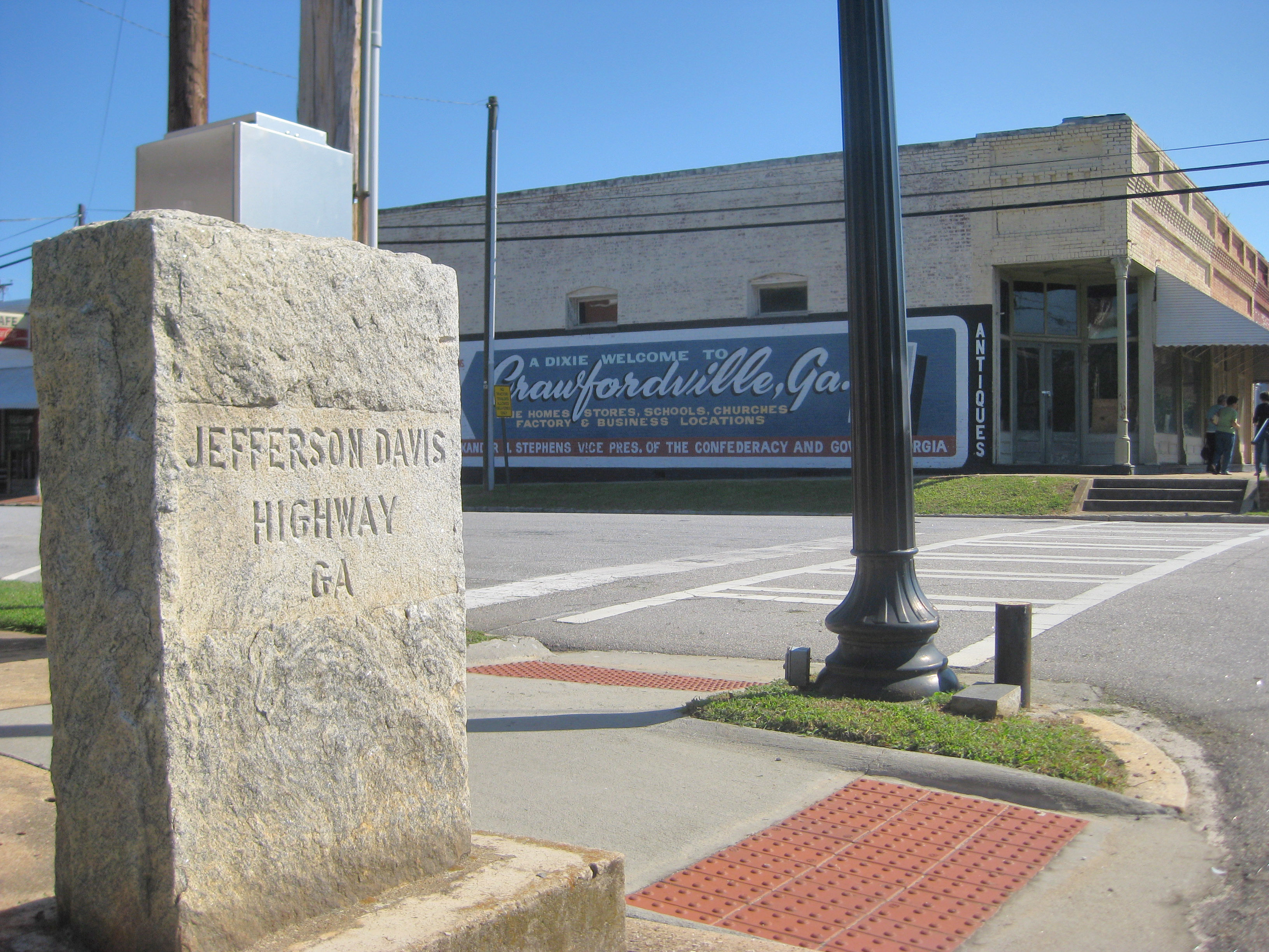 Description: A marker for the Jefferson Davis Highway sits at the corner of the intersection of Georgia S.R. 12 (Broad Street) and Monument Street, across from a mural welcoming visitors to Crawfordville, Georgia.
