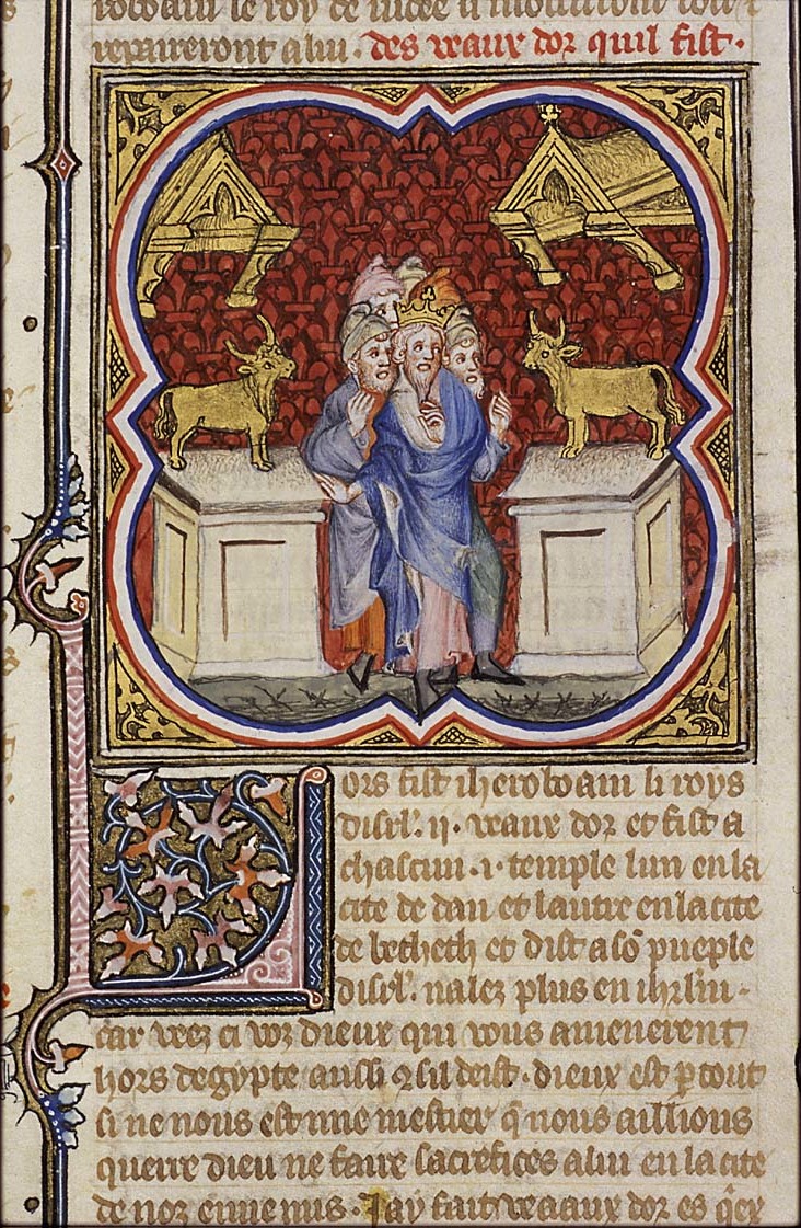 Description: Jeroboam sets up two golden calves, from the Bible Historiale. Den Haag, MMW, 10 B 23 165r