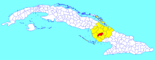 Description: A map of the municipality of Jimaguayú (shown in red) within the Province of Camagüey (yellow) and Cuba.
