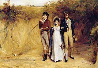 Description: ("Two strings to one's bow" is a traditional English proverb, and also puns on "beau" here.) This Victorian "genre" painting depicts a Regency (early 19th-century) young lady delighted at being the focus of attention of two rival "beaux" (handsome potential suitors), and even seeming to enjoy playing them off against each other. It would probably have struck a somewhat false note (with respect to the prevailing standards of 1882) for a Victorian artist to portray a contemporary respectable Victorian young lady uninhibitedly rejoicing in playing such a game (unless the illustration was didactically disapproving); but by moving it back to the Regency, it all somehow became quaint and historical, and the artist was freed from any perceived necessity to offer a moral lesson. (In Pettie's painting, the bodice of her dress and the sharp vertical creases spaced widely around the hem are not really authentic Regency styles.)
