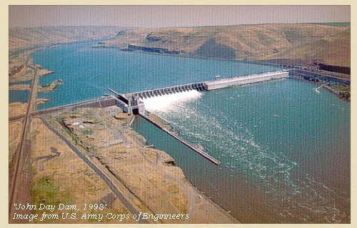 Description: The John Day River in northeastern Oregon contains over 500 river miles and is the second largest undammed tributary in the western United States, after the Yellowstone River. Its spring chinook salmon and summer steelhead populations are two of the last remaining intact wild populations of anadromous fish in the Columbia River basin. The John Day River has also been kept relatively free of hatchery influences. Many segments of the John Day River have been designated under the federal Wild Scenic Rivers Act and Oregon's State Scenic Waterways Act. Topographically, the John Day basin is an interior plateau bounded by the Columbia River to the north (Lake Umatilla), the Blue Mountains to the east, the Aldrich Mountains and Strawberry Range to the south, and the Ochoco Mountains to the west. The basin drains a large portion of northeast Oregon (nearly 8,100 square miles), flows 284 miles from its source in the Strawberry Mountains (9,000 feet), to its mouth at RM 217 on the Columbia River (200 feet). The John Day basin is characterized by diverse landforms ranging from loess-covered plateaus in the lower sections to glaciated alpine peaks in the headwaters. Elevations range from 200 feet at the mouth of the John Day River to over 9,000 feet in the Strawberry Mountains. Two major physiographic provinces exist in the John Day basin -- the Deschutes-Umatilla Plateau and the Blue Mountains. A third province, the Columbia Basin, is a minor province along the confluence with the Columbia River. -- Columbia Basin Fish and Wildlife Authority Website, 2002