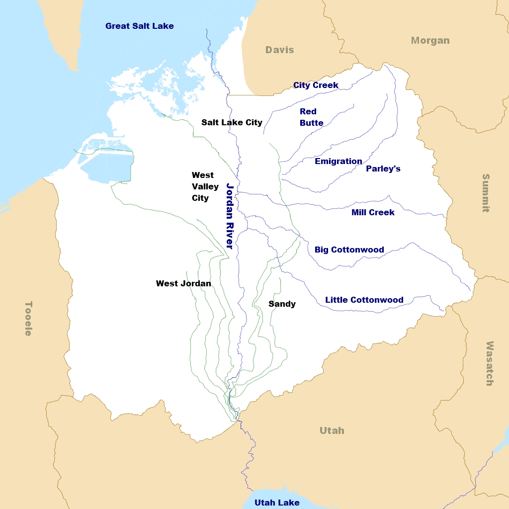 Description: A map of the Jordan River watershed, exclusive of the drainage basin surrounding Utah Lake, which also flows into the Jordan. Rivers and creeks are in blue. Canals are in gray.