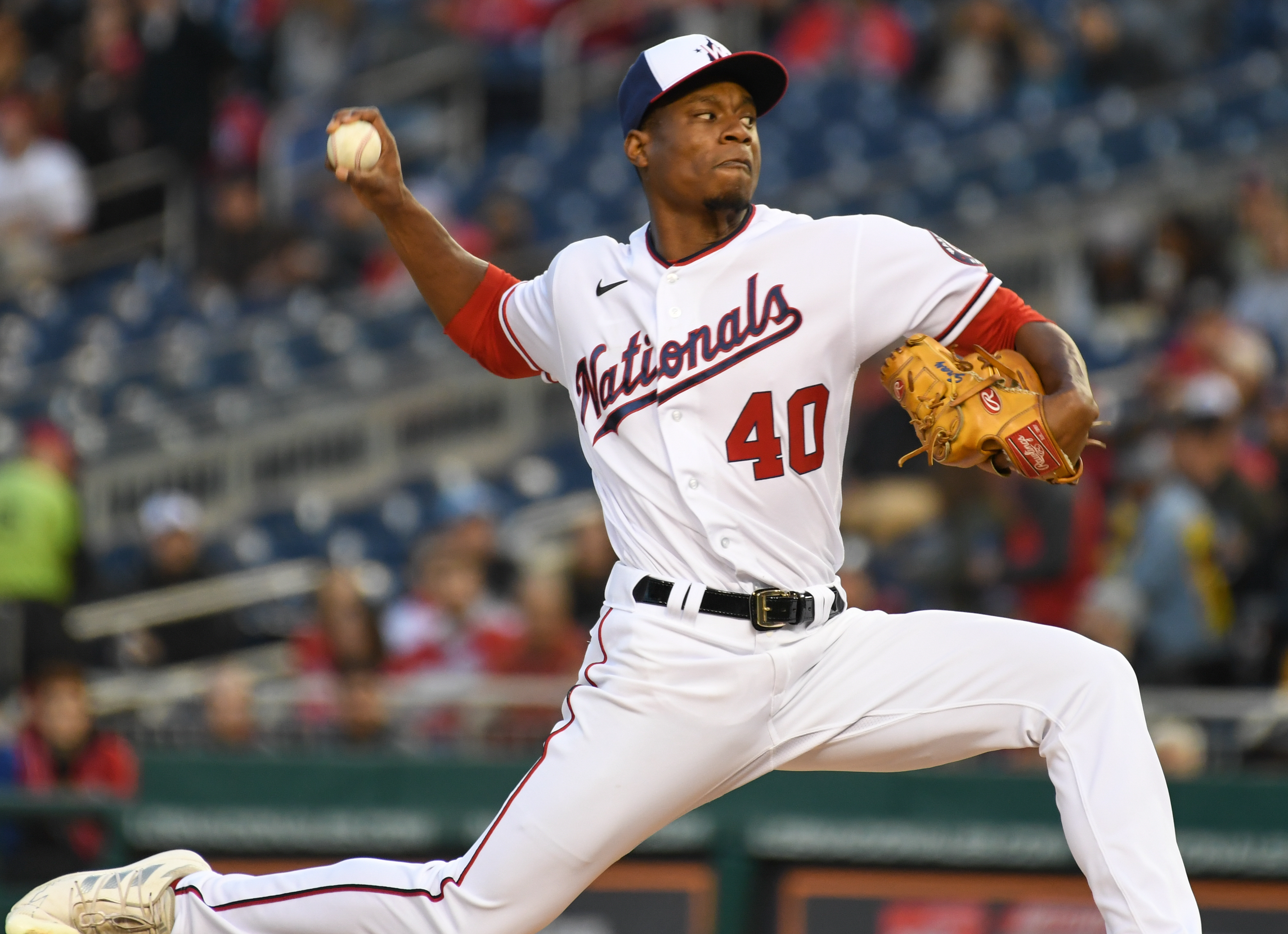 Description: Washington Nationals starting pitcher Josiah Gray (40) in mid-delivery in a game against the New York Mets at Nationals Park in Washington D.C., April 8, 2022. (Photo by All-Pro Reels)