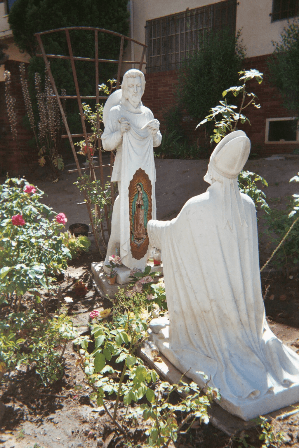 Description: Statue of Juan Diego and Bishop Juan de Zumárraga in front of St. Teresa of Avila Catholic Church in Echo Park (posibly Silver Lake?), Los Angeles, California. I took the photo July 8, 2006.
