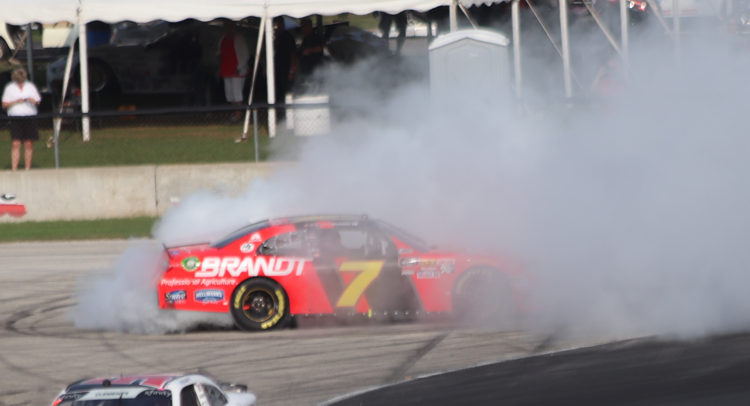 Description: NASCAR driver Justin Allgaier does burnouts in Turn 5 after winning the 2018 Johnsonville 180 NASCAR Xfinity Series race at Road America.