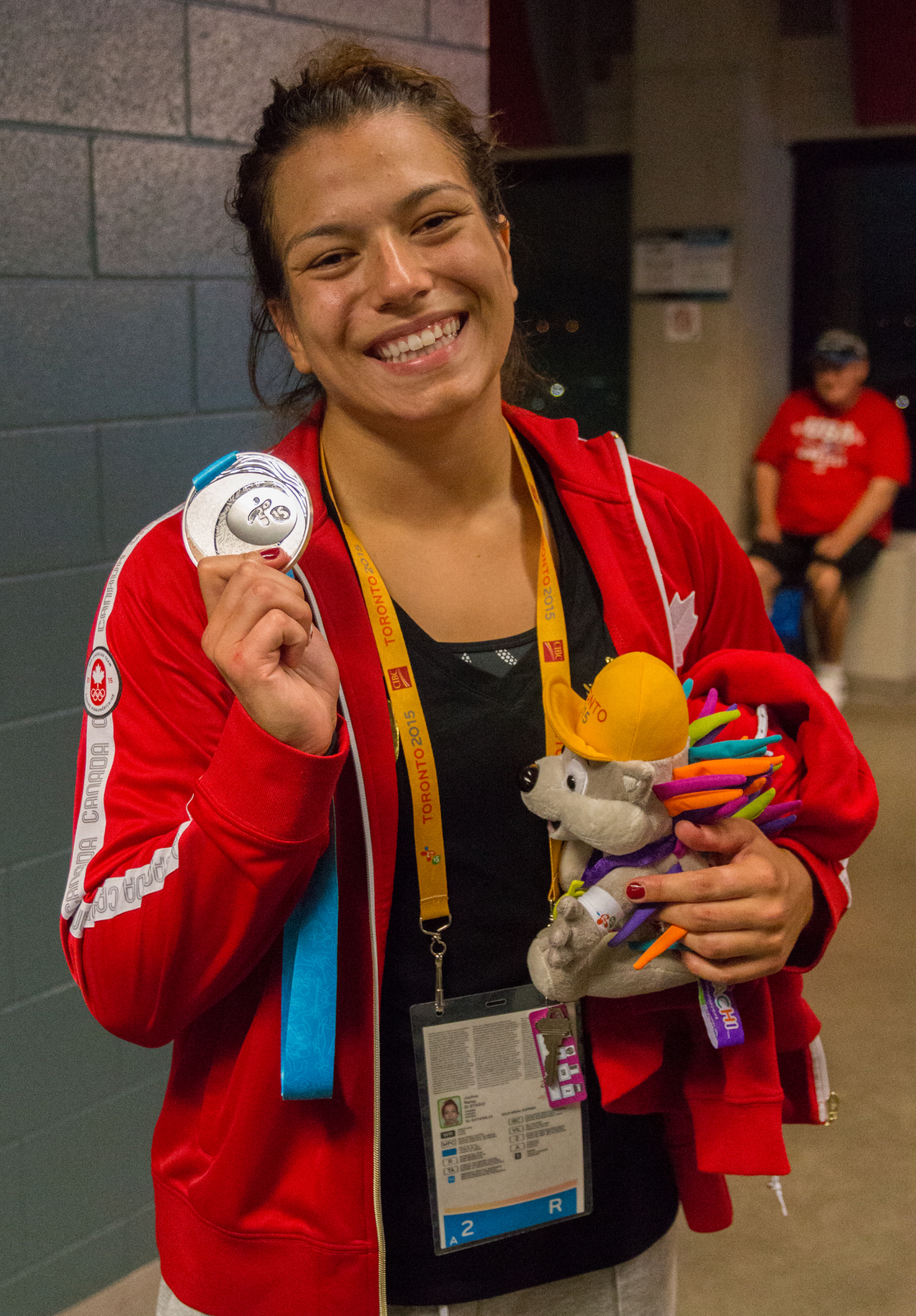 Description: Justina Di Stasio at 2015 Pan Am Games showing her silver medal in women's freestyle wrestling