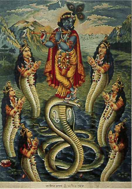 Description: The story of Kalinga Mardhana / Kaliya Daman. Krishna dancing over Kāliyā after subduing him. The wives of Kaliya plead for mercy. Anonymous image; copyright expired in India 60 years after publication (i.e. by 1940).