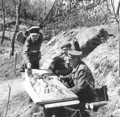 Description: Major-General Charles Keightley (right), commander of the 78th Infantry Division, at work. On a table outside the General's dug-out is a model of the Cassino area. Lieutenant. R. Grimshaw (left) is pointing out a feature to Lieutenant-Colonel D.E.P. Hodgson, Welsh Guards (middle).