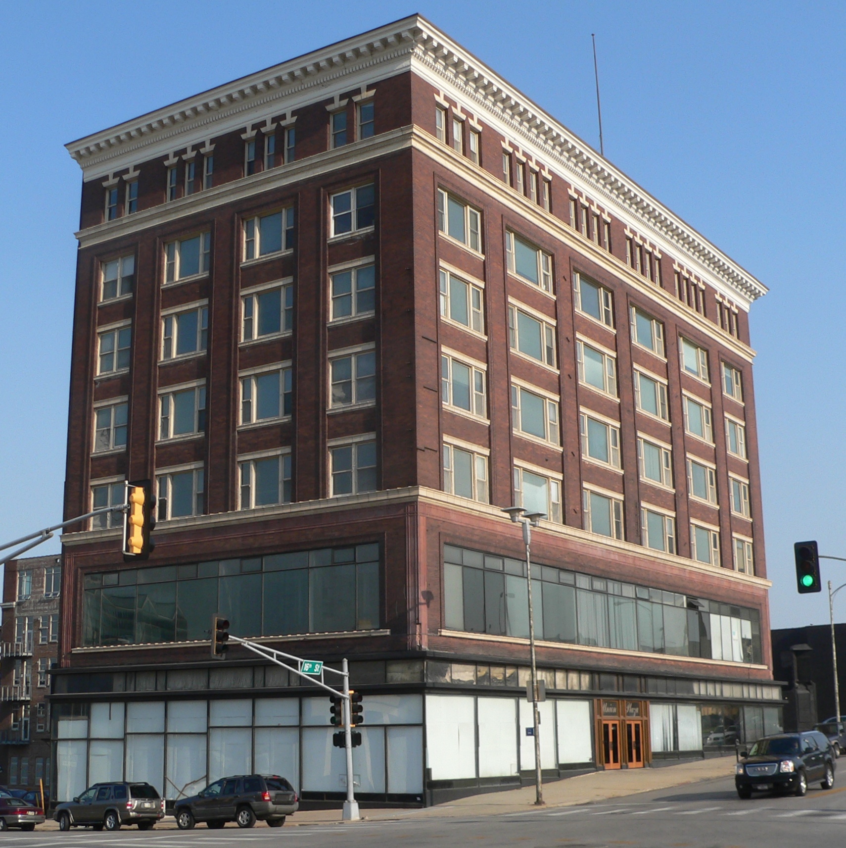Description: Kennedy Building, located at 1517 Jackson Street (southeast corner of 16th and Jackson) in Omaha, Nebraska; seen from the northwest. The sunlit west side faces 16th; the shaded north side faces Jackson.
