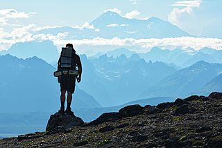 Description: A hiker on Kesugi Ridge, in Denali State Park, looking toward Denali.