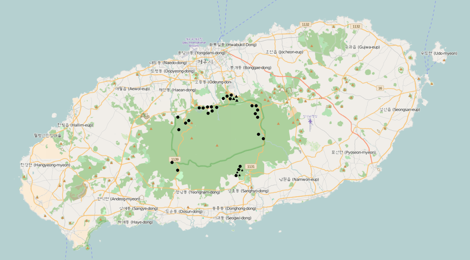 Description: Distribution of King cherry in Mt. Halla in Jeju Island in 1998. ★ and ▲ represent Natural Monument No. 156 and No. 159 respectively.