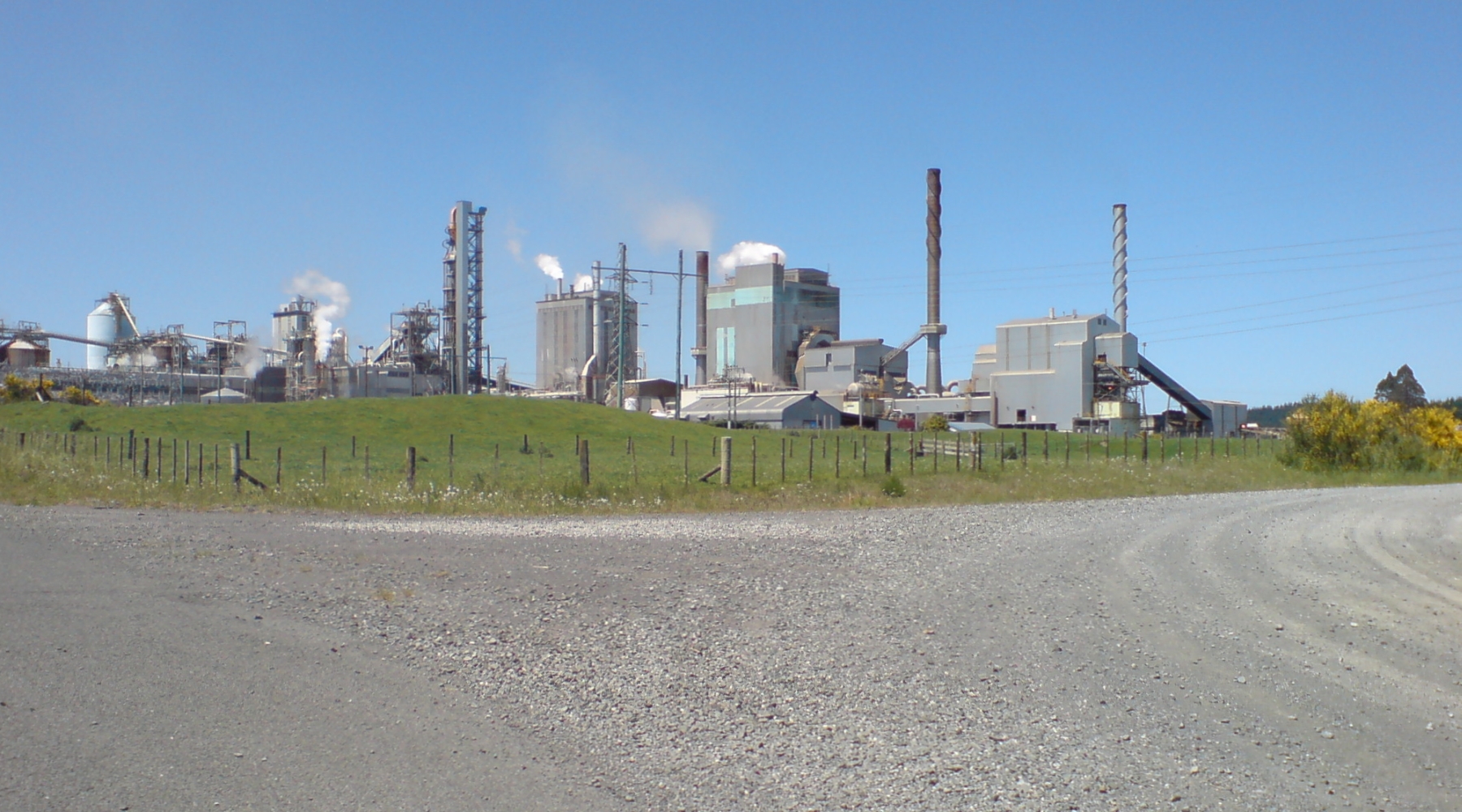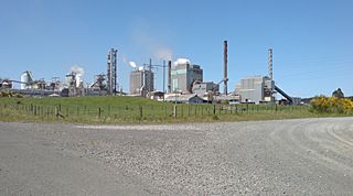 Description: Kinleith Mill, a paper and pulp mill in the Waikato Region of New Zealand. The building at the right is a cogeneration power plant burning wood waste to provide electric power. This is in turn mainly used in the paper-making process.