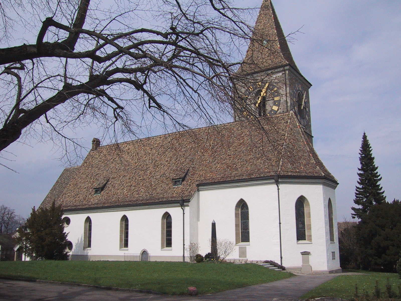 Description: Aufnahme der Kirche von Kilchberg bei Zürich, davor das Grabmal von Conrad Ferdinand Meyer