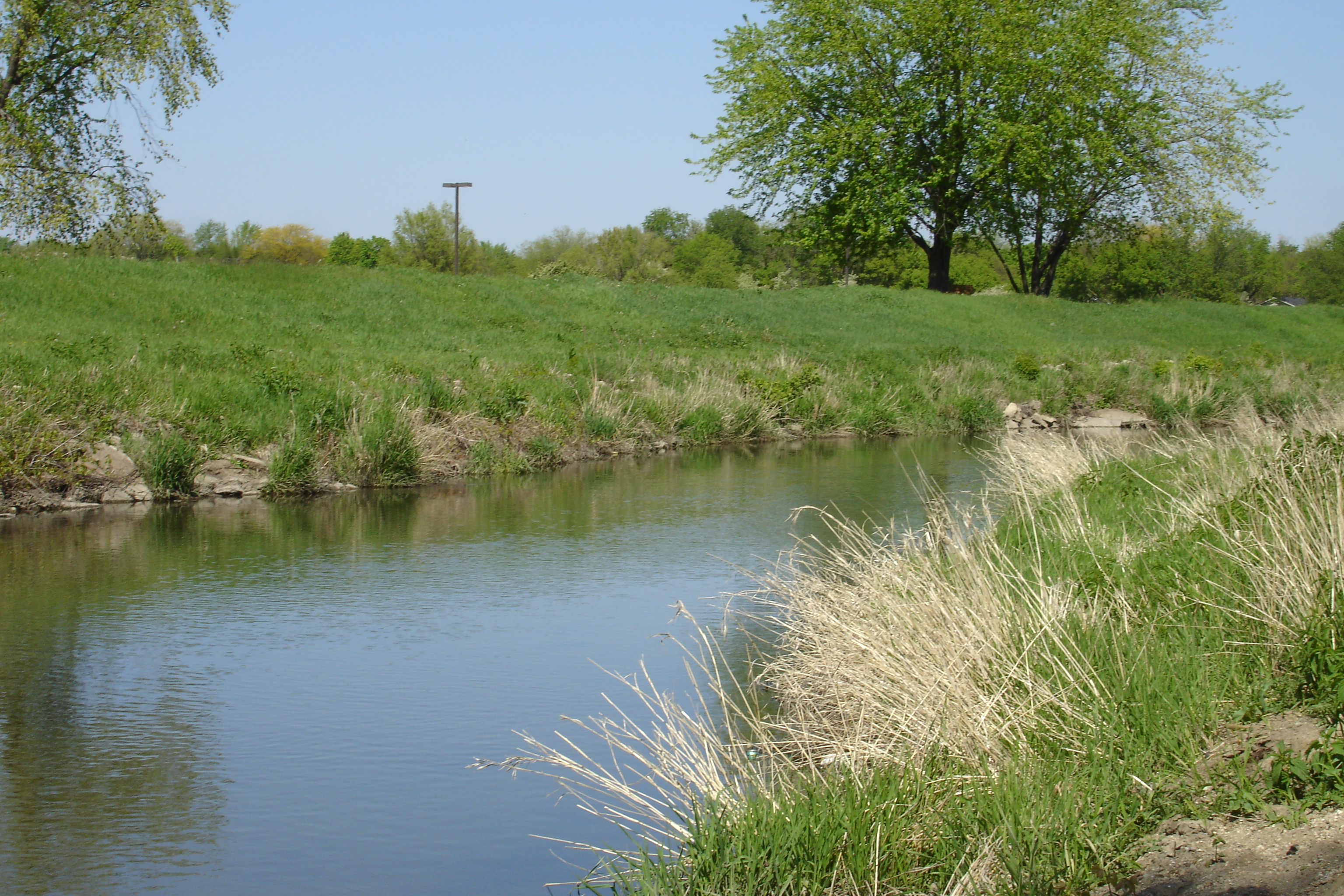 Description: The Kishwaukee River meanders by Annie's Woods in DeKalb in Spring 2006. Grasses along the river bank.