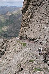Description: A climber descending Kit Carson Avenue towards Challenger Point