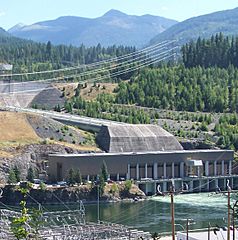 Description: Kootenay River between Nelson, BC and Castlegar, BC, Canada South Slocan Dam buildings are at the bottom of the frame