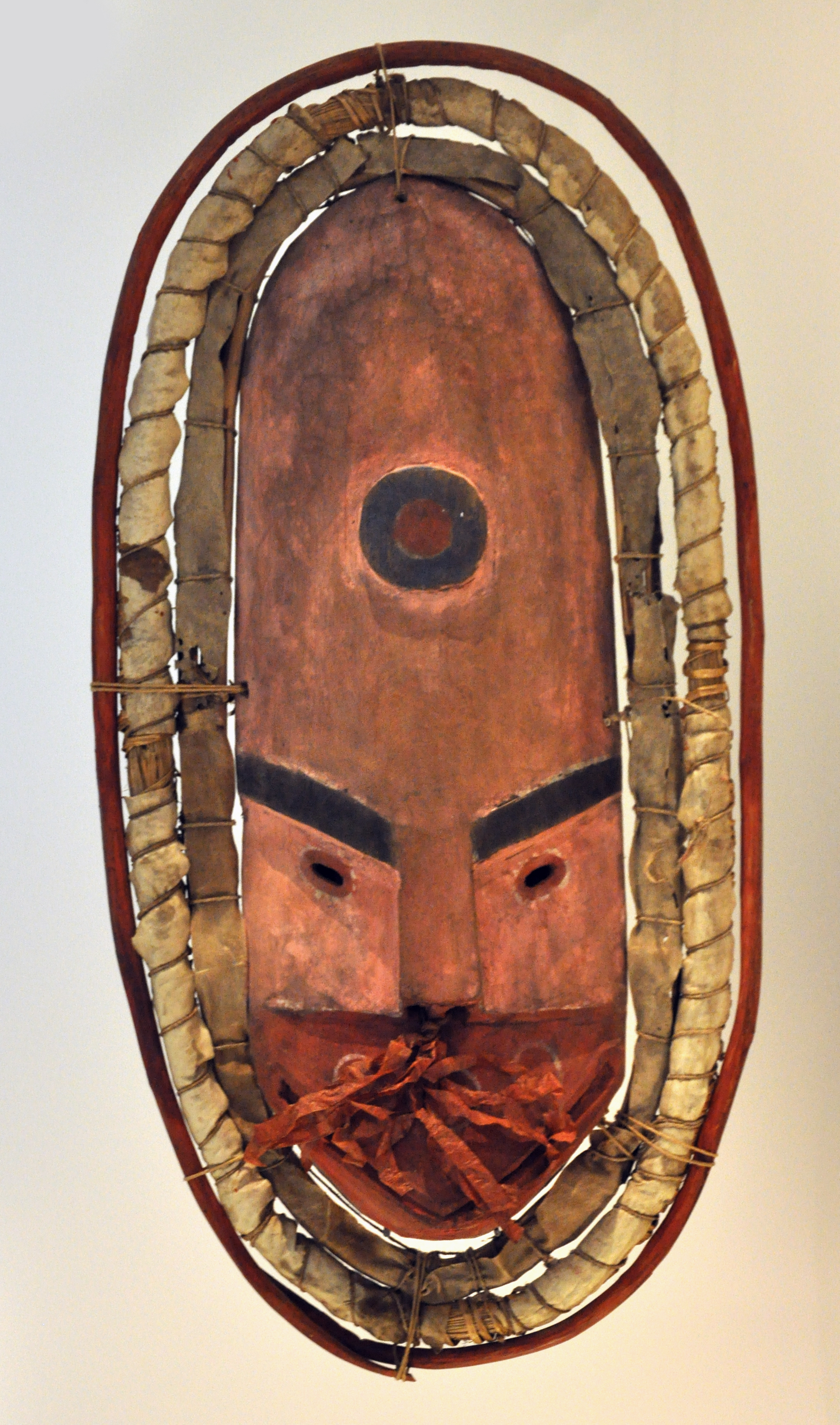 Description: British Museum reference Am1890,0908.9 Detailed description Mask from Kuskokwim Bay (wood, fur, straw, feather, leaf) Size length: 57 cm Location Room 24