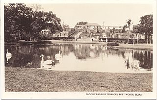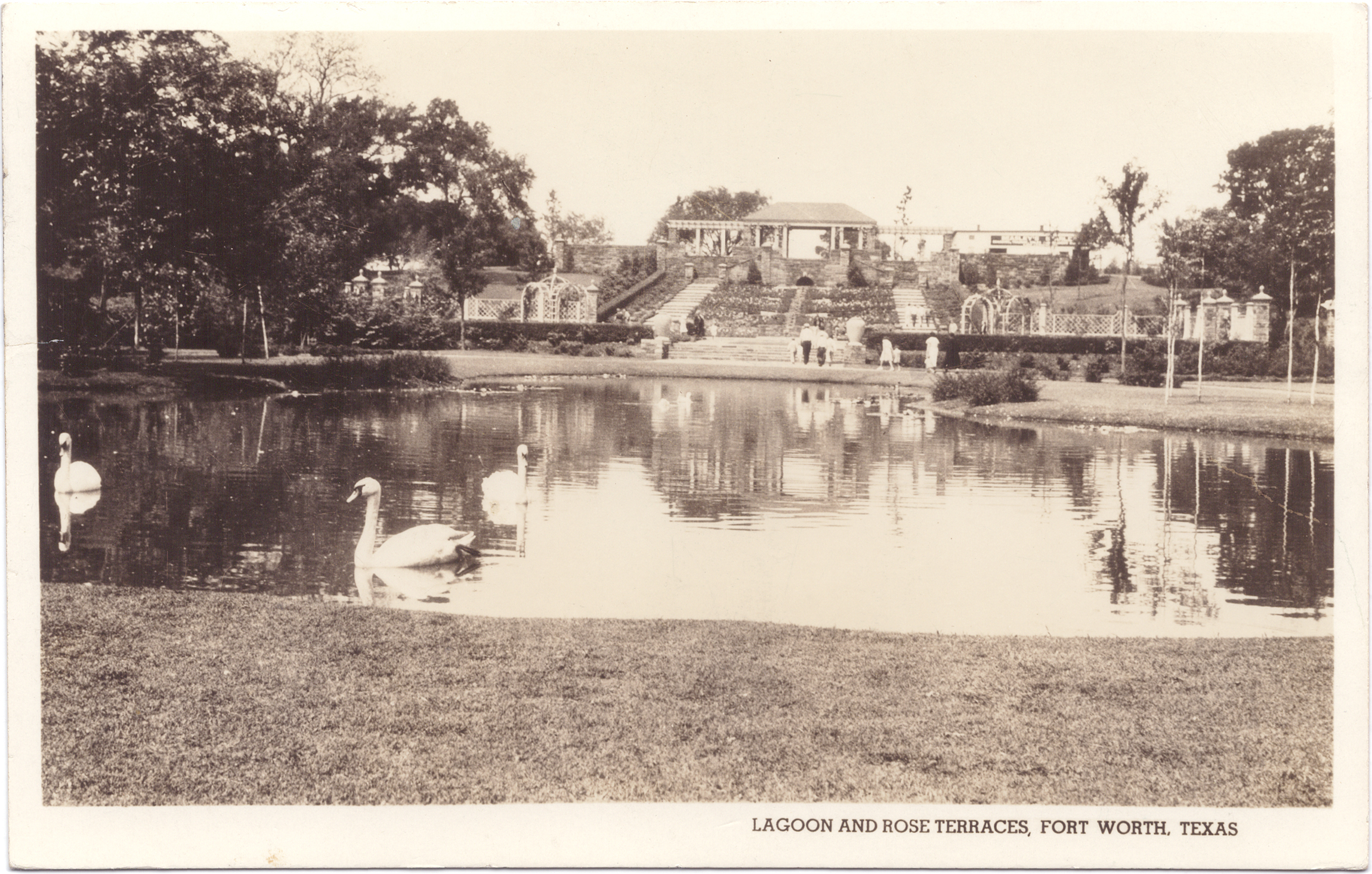 Description: Postcard: Lagoon and Rose Terraces, Fort Worth, Texas. The postcard features a photo of the lagoon with two swans swimming in it and the rose terraces behind it.