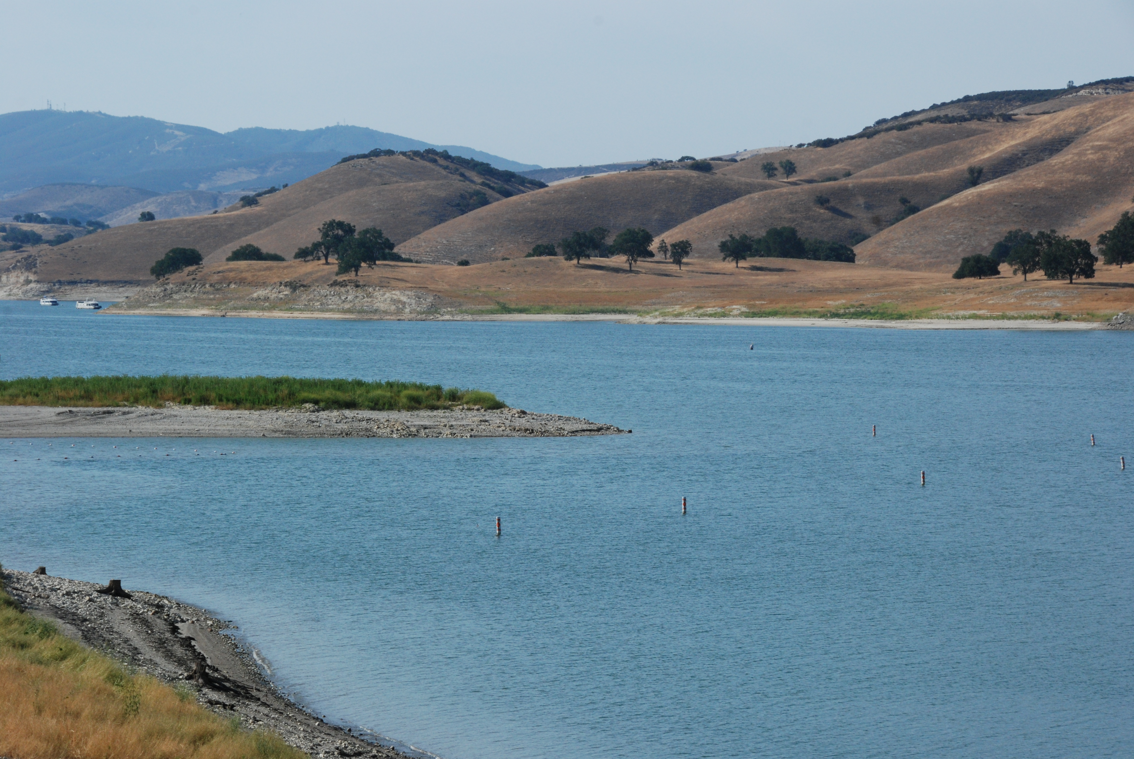 Description: Lake San Antonio — a reservoir in northern San Luis Obispo County and southern Monterey County, in central California. Located within the Santa Lucia Mountains. Reservoir level in April 2009.