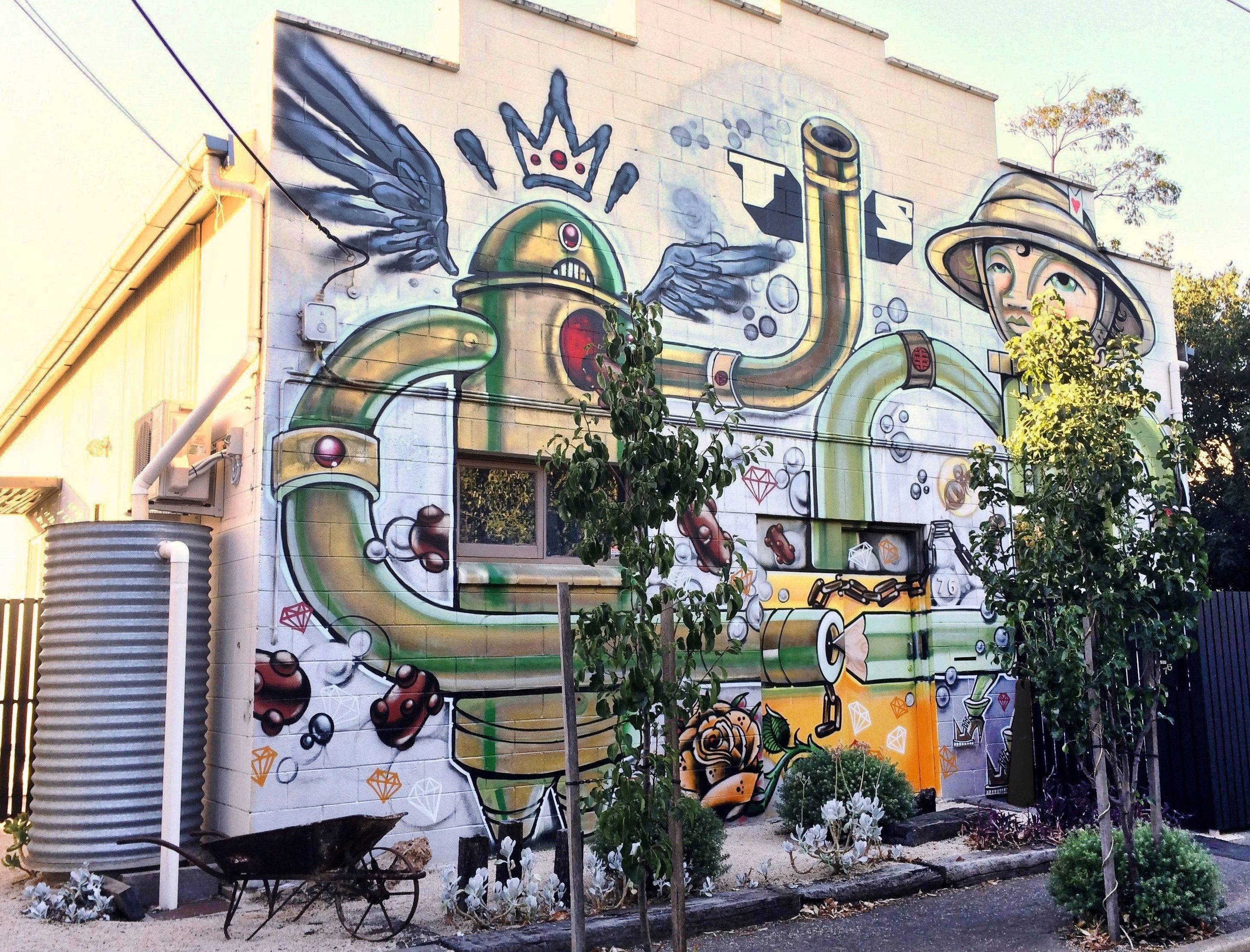 Title: Large mural on a converted warehouse, Drayton Street, Bowden