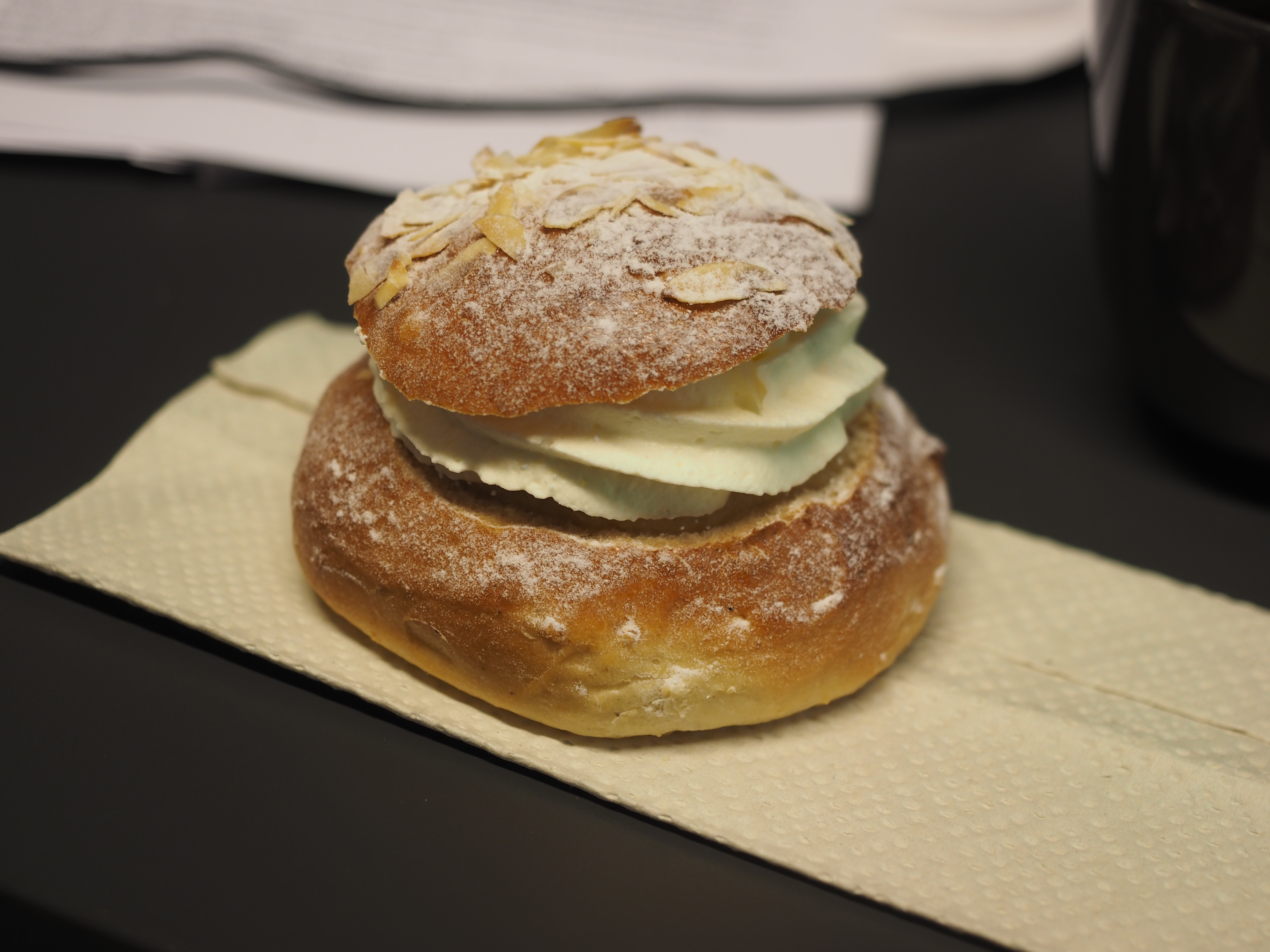 Description: A Finnish laskiaispulla (Shrovetide pastry) consisting of two pastry slices with ground almond and whipped cream between them, with slices of almond at the top, at an office in Vantaankoski, Vantaa, Finland.