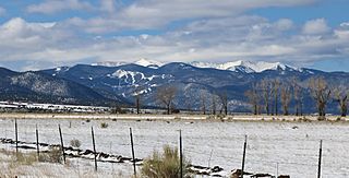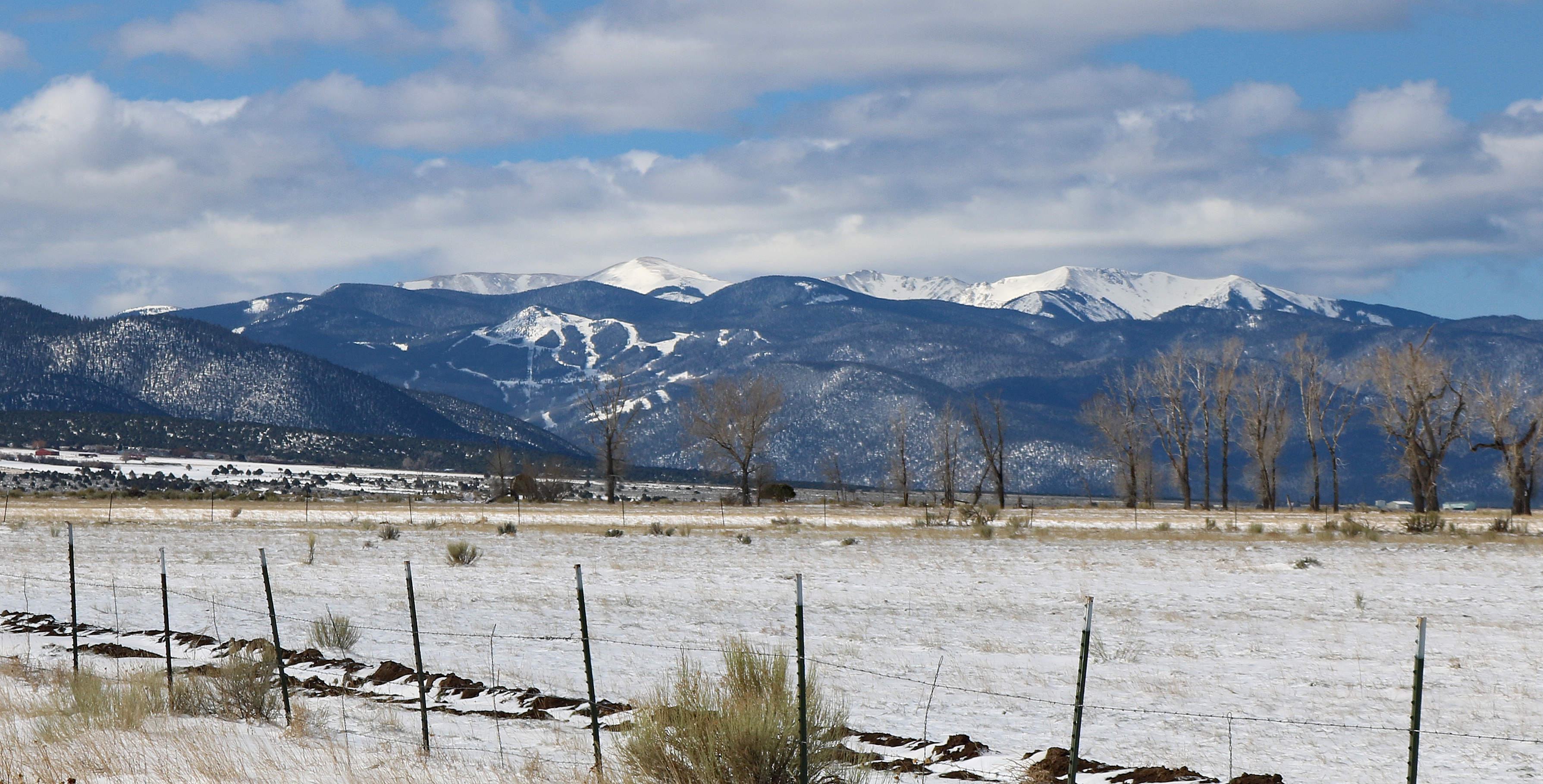 Description: A view of Latir Peak and nearby mountains in northern New Mexico. The old Rio Costilla ski resort can also be seen. The view is from County Road 21, south of San Luis, Colorado.