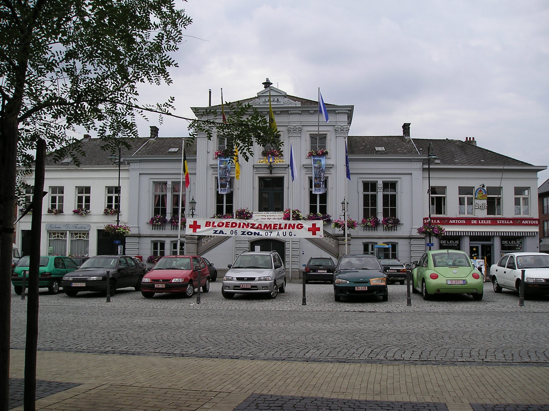 Description: Town hall of the town of Lebbeke, Belgium with a Blood donation banner hanging on the facade.